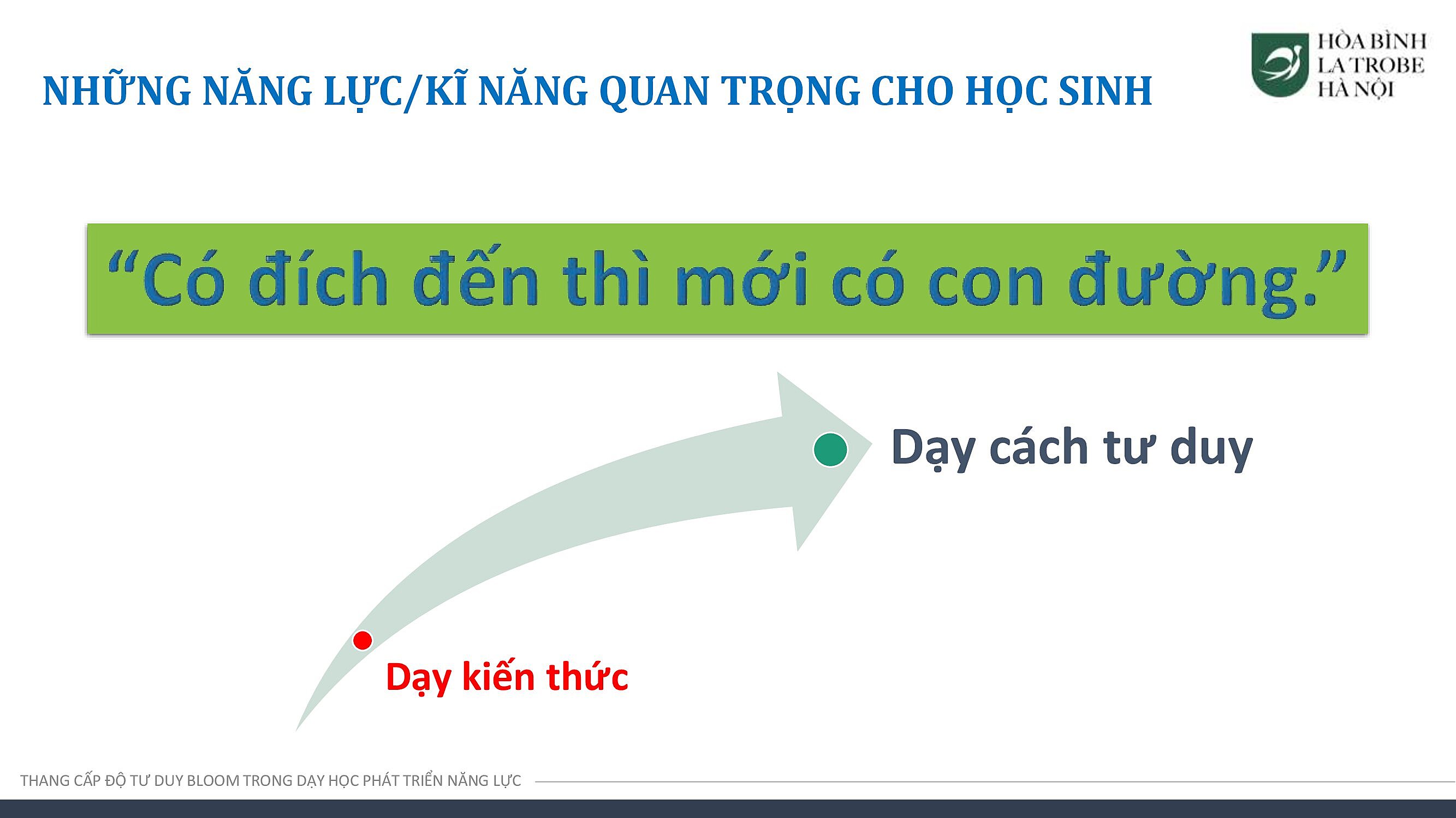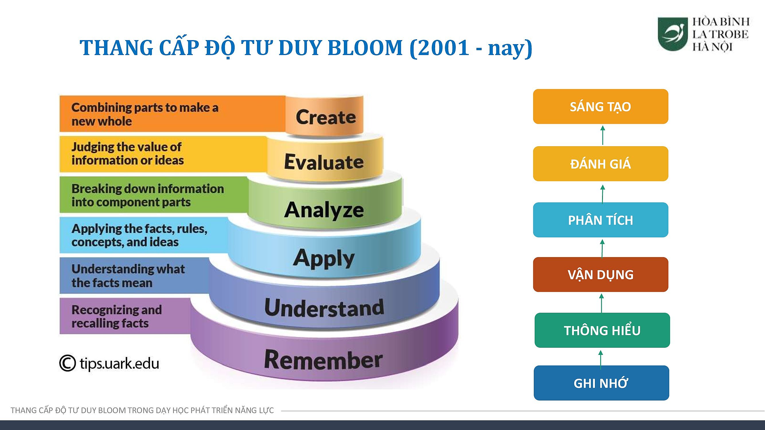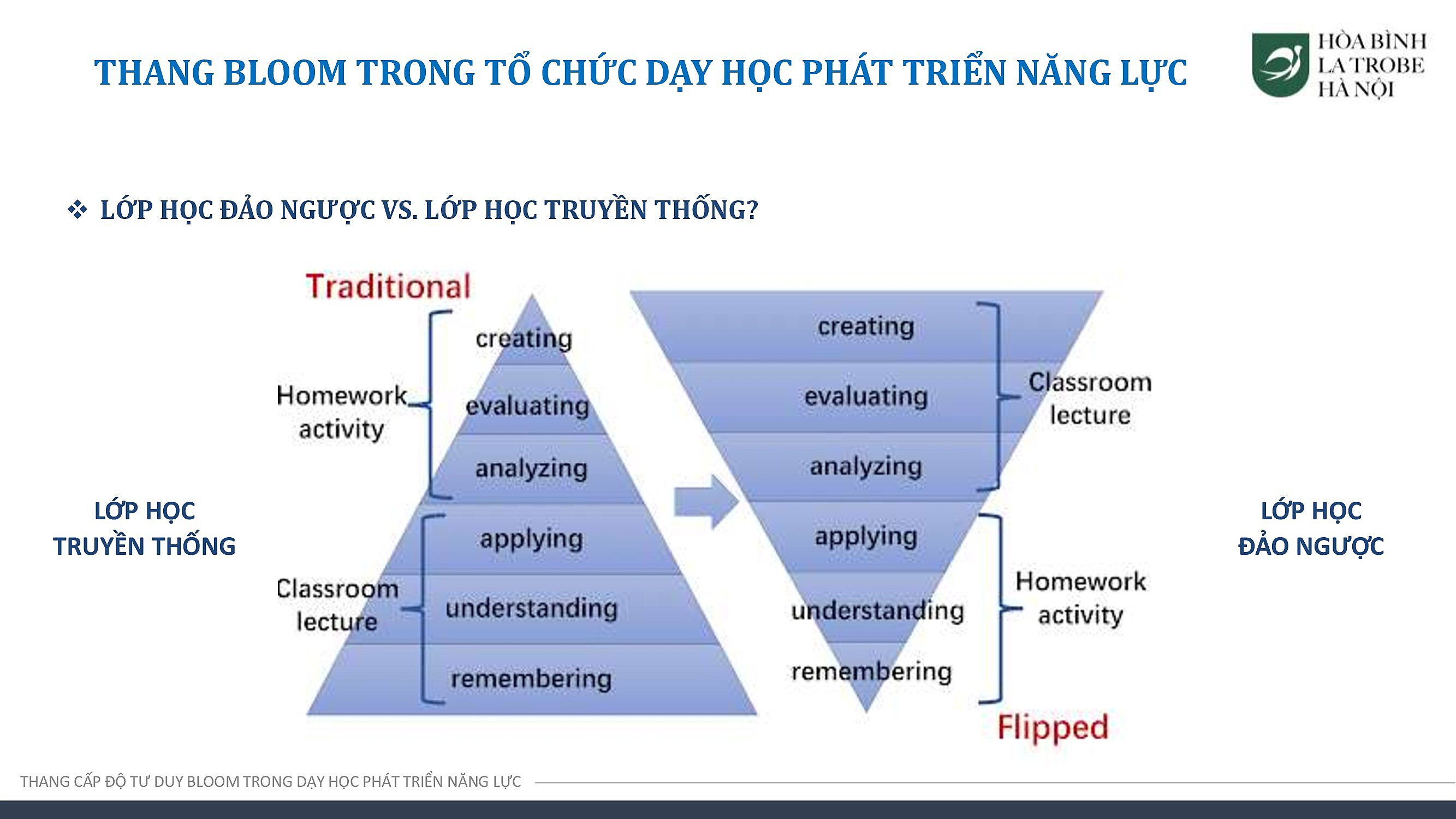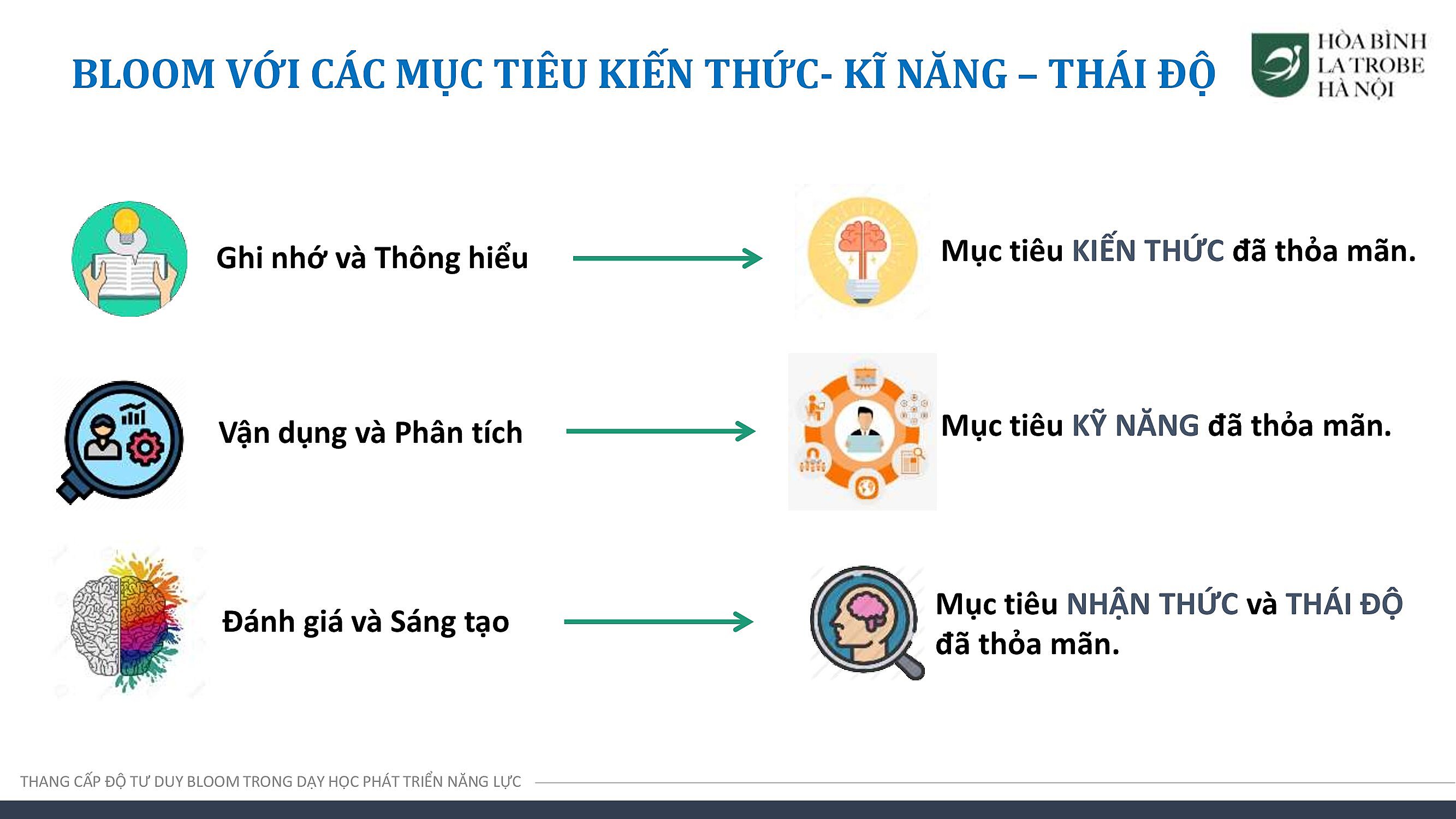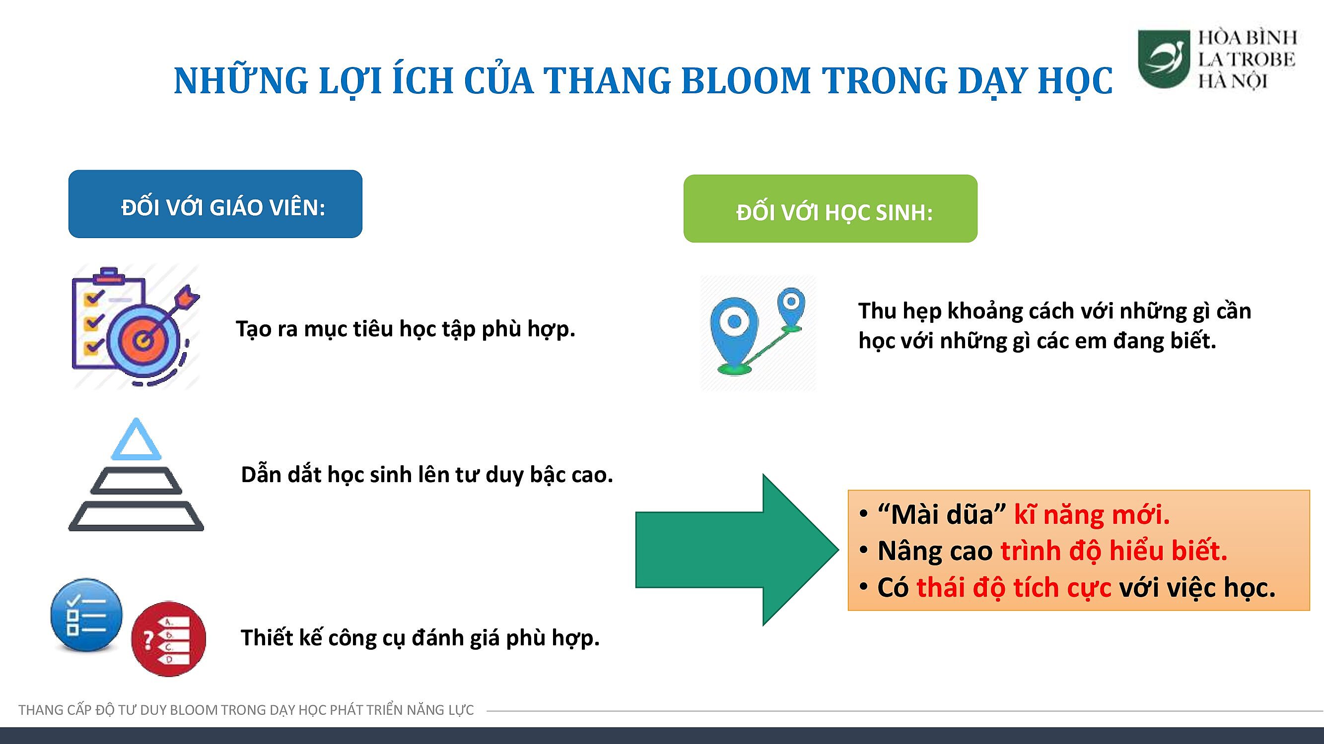Với các nội dung được đào tạo, đội ngũ giáo viên của Hòa Bình – La Trobe – Hà Nội có thể phân tích, đánh giá được bản chất của từng cấp độ thang Bloom trong việc giảng dạy, đồng thời từng bước linh hoạt, sáng tạo, vận dụng thang Bloom trong việc tạo ra các bài học, giúp phát triển năng lực tư duy bậc cao cho học sinh.