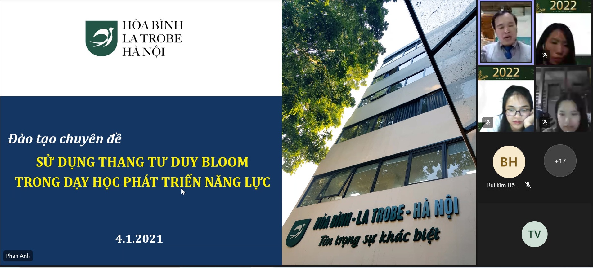 Ngày 28/12/2021 và 4/1/2022 vừa qua, Nhà trường cũng đã tổ chức các buổi đào tạo cho đội ngũ giáo viên với chủ đề “Sử dụng thang tư duy Bloom trong dạy học phát triển năng lực” theo hình thức trực tuyến dưới sự hướng dẫn của Th.S Phan Anh.