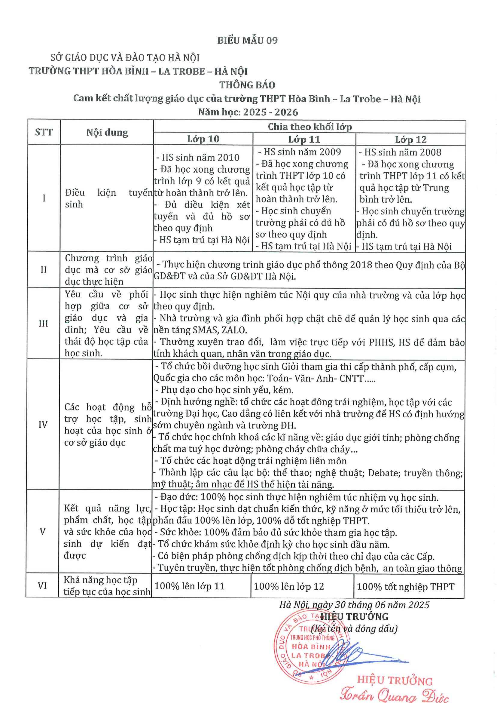 Cam kết chất lượng giáo dục của trường THPT Hoà Bình - La Trobe - Hà Nội, Năm học 2025-2026