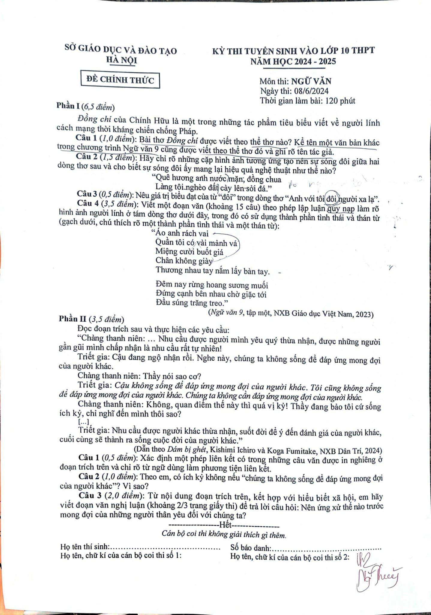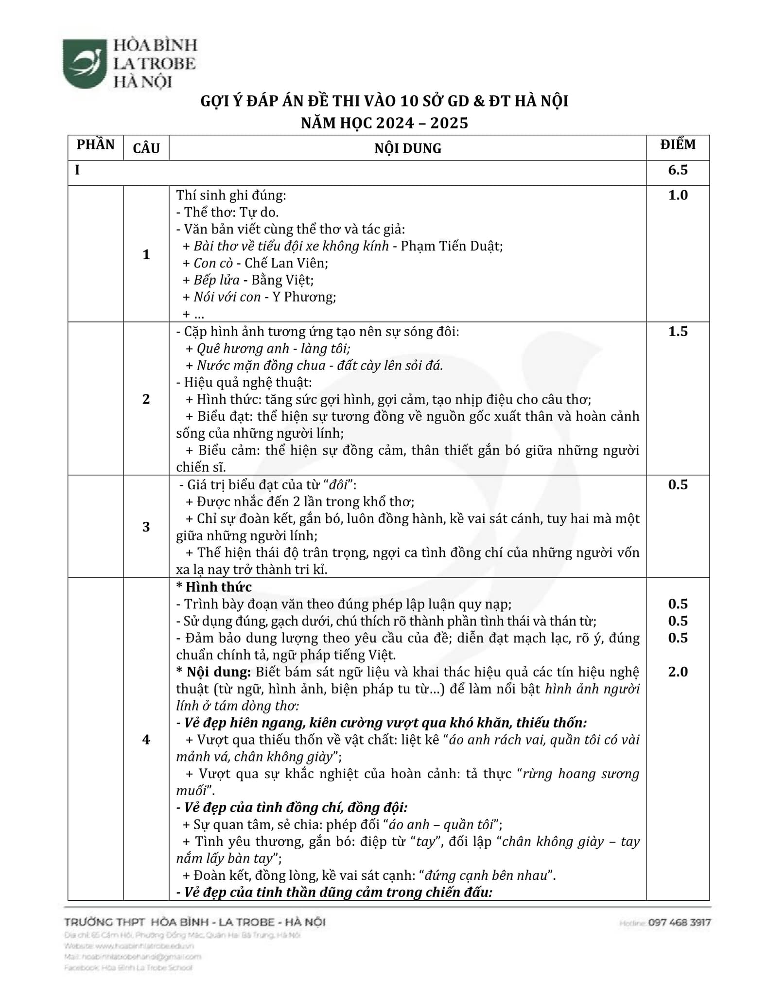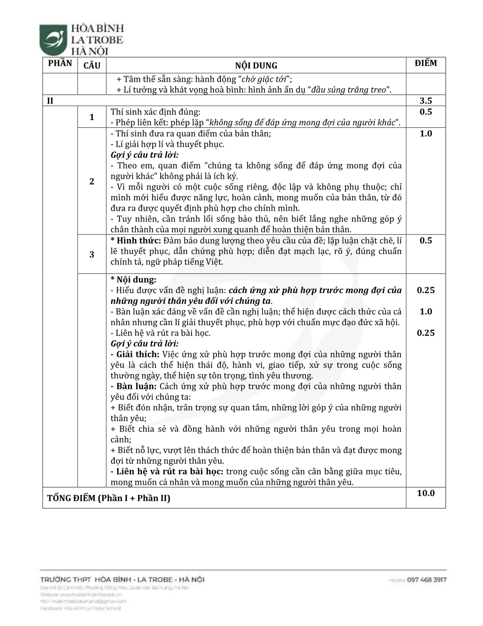 Dưới đây là gợi ý đáp án chi tiết môn Ngữ Văn thi vào lớp 10 do đội ngũ giáo viên của trường THPT Hòa Bình – La Trobe – Hà Nội thực hiện. Quý Phụ huynh và các bạn học sinh có thể tham khảo!