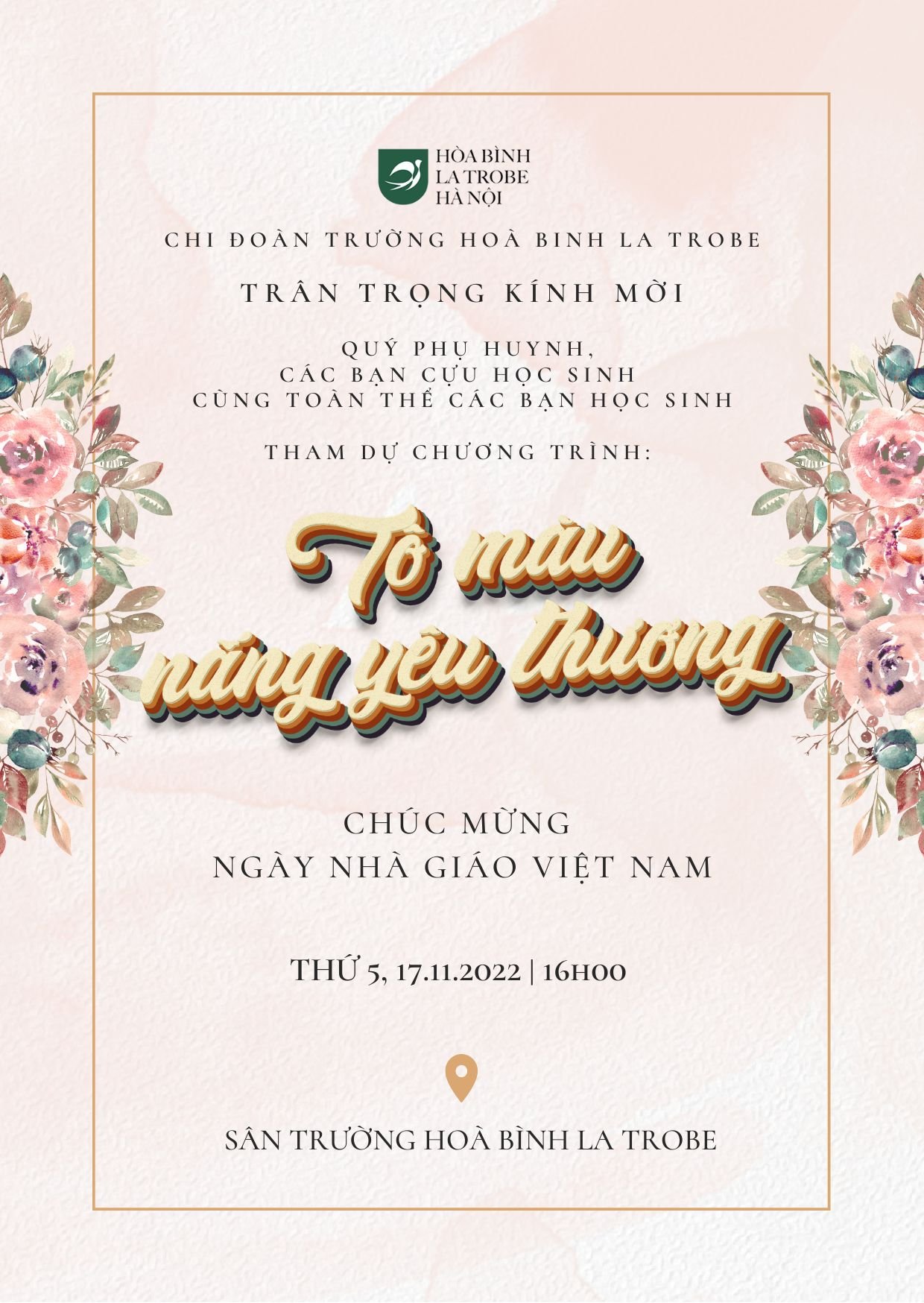 Chi đoàn Trường Hòa Bình La Trobe xin trân trọng gửi lời mời tới Quý Phụ huynh, các bạn cựu học sinh và toàn thể các bạn học sinh của Hòa Bình La Trobe tới tham dự chương trình Tri ân Thầy Cô với chủ đề "Tô màu nắng yêu thương".