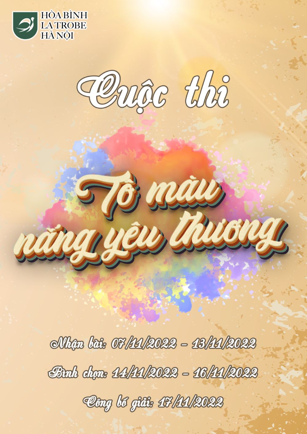 - Thời hạn gửi sản phẩm: GVCN các lớp gửi bài dự thi từ ngày 07/11/2022 đến 23:59 ngày 13/11/2022 vào địa chỉ email: hoant1@hoabinhlatrobe.edu.vn