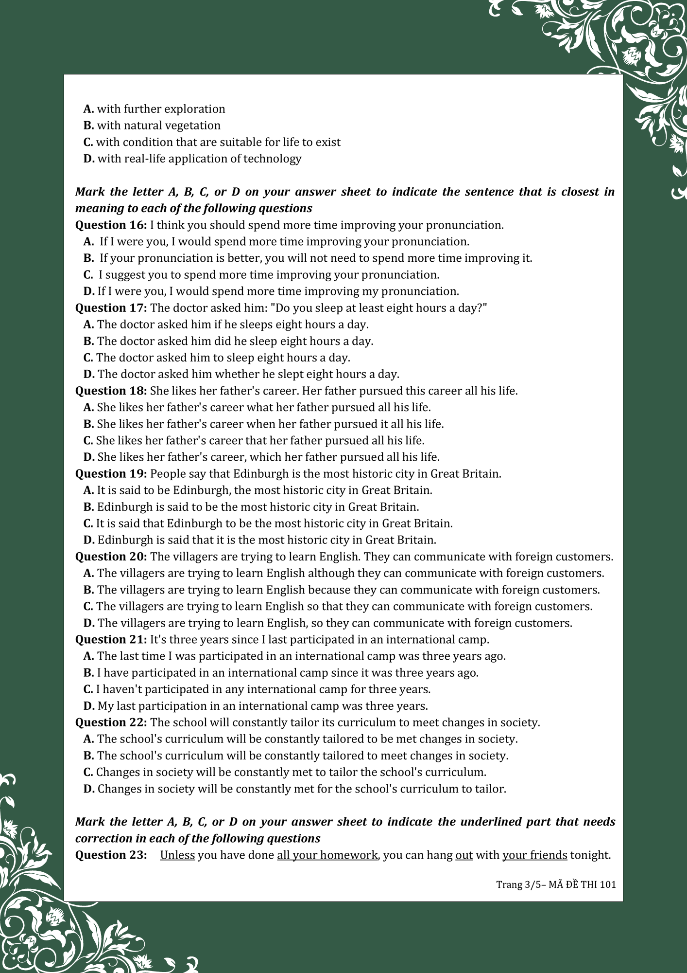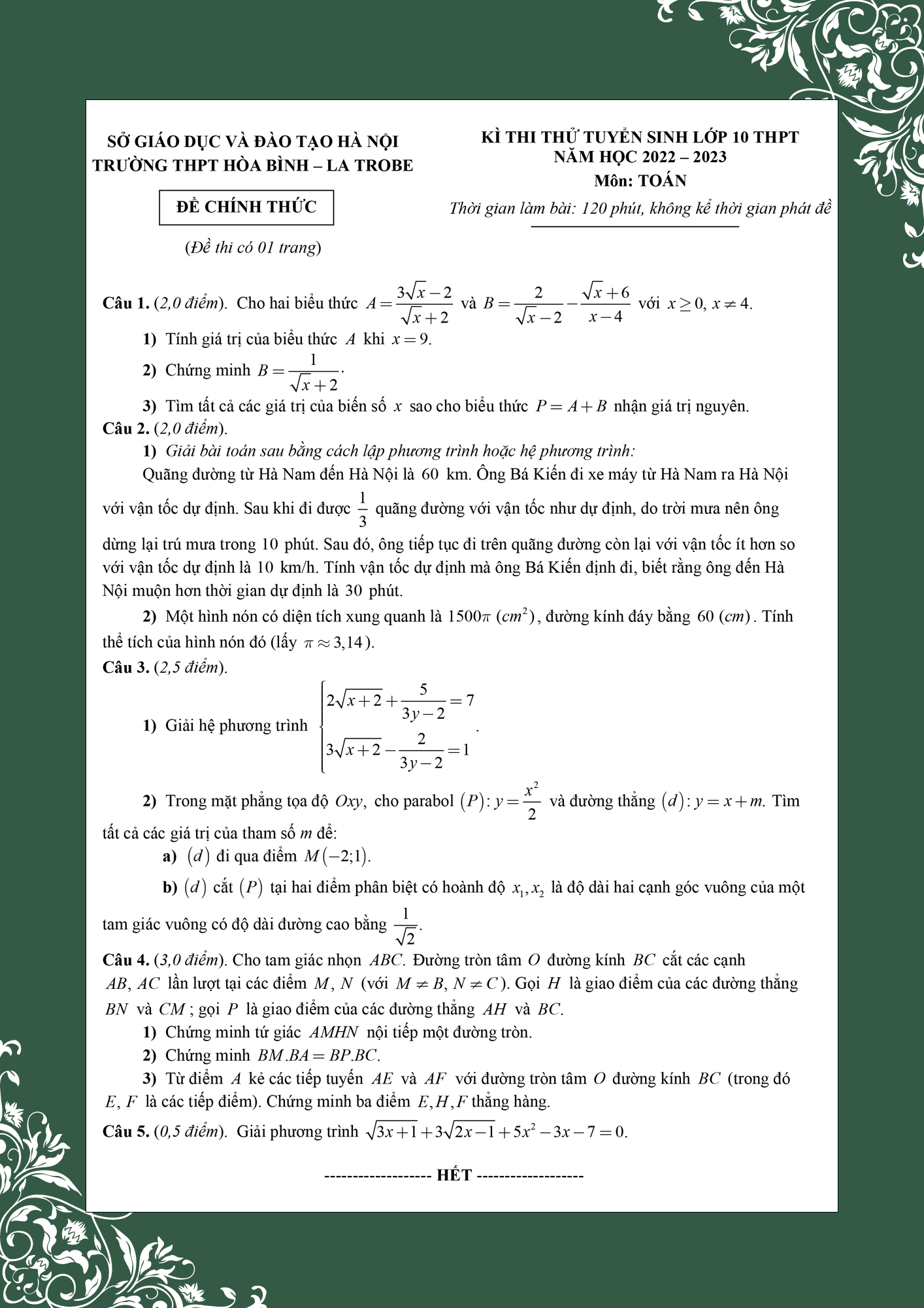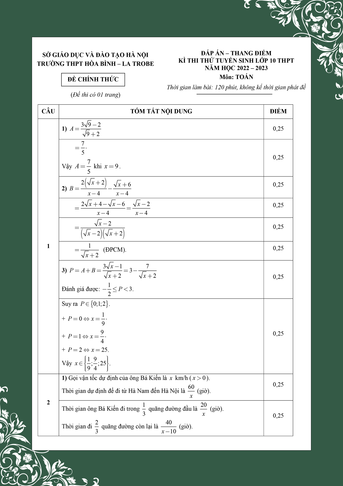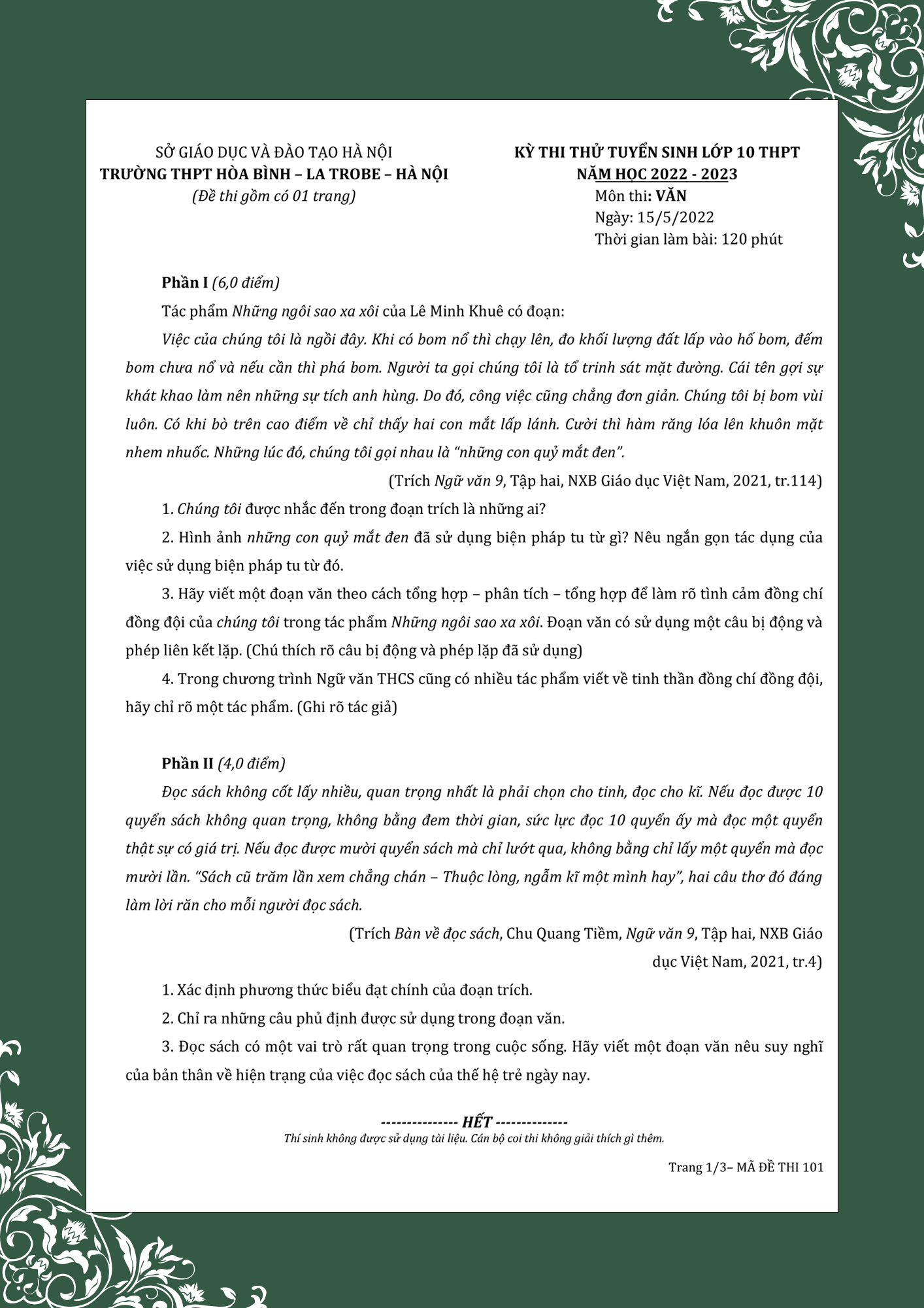 Sau đây là đề thi thử vào 10 cùng đáp án 3 môn Toán – Ngữ văn và Tiếng Anh được tổ chức tại Hòa Bình – La Trobe – Hà Nội vào ngày 15/5 vừa qua.