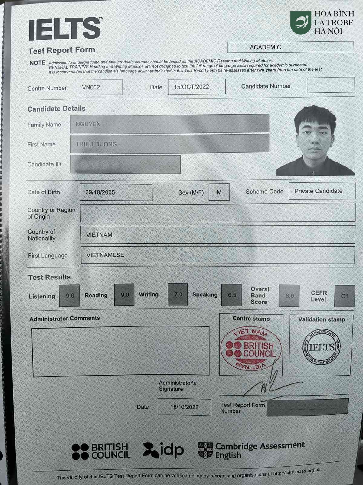 Tháng 10 sôi động, ngập tràn cảm xúc ở Hòa Bình La Trobe kết thúc cùng với tin vui đến từ Nguyễn Triều Dương - Lớp 12C cùng thành tích ấn tượng 8.0 IELTS.