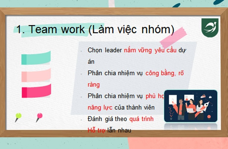 Teamwork: Thực hiện phân công leader, phân chia nhiệm vụ triển khai, giám sát báo cáo tiến độ dự án và cuối cùng là trình bày sản phẩm kết quả của cả nhóm, đánh giá quá trình của cá nhân và cả nhóm.
