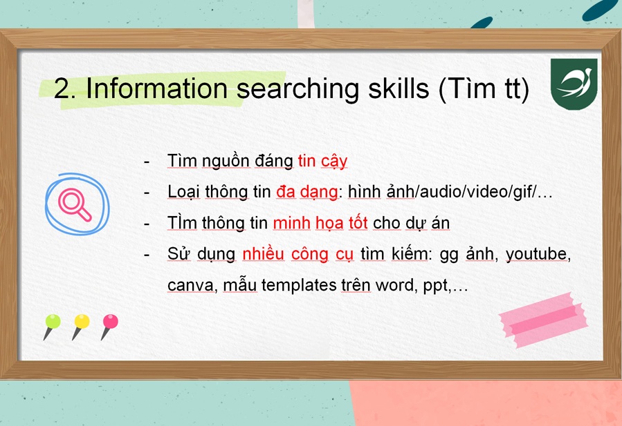 Information searching skills (Tìm thông tin): Dự án trao quyền cho học sinh chủ động tìm tòi thông tin chính xác, tin cậy theo hướng dẫn của giáo viên. Học sinh sẽ được giới thiệu các nguồn tìm kiếm uy tín liên quan đến nội dung chủ đề, tìm thông tin đa dạng minh hoạ cho nội dung dự án.