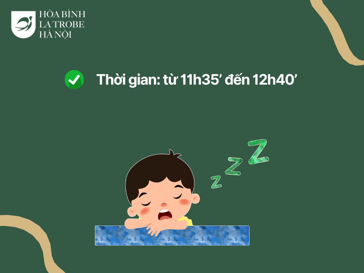 Trong thời gian nghỉ trưa, các con sẽ được cung cấp suất ăn đúng giờ, chất lượng bữa ăn được đảm bảo. Thông qua bữa ăn bán trú, các con học sinh được rèn kỹ năng xếp hàng, kỹ năng tự phục vụ, kỹ năng giao tiếp khi dùng bữa...Các con có phòng nghỉ ngơi thoải mái, khu vực nam nữ riêng biệt, và có giáo viên trông bán trú.