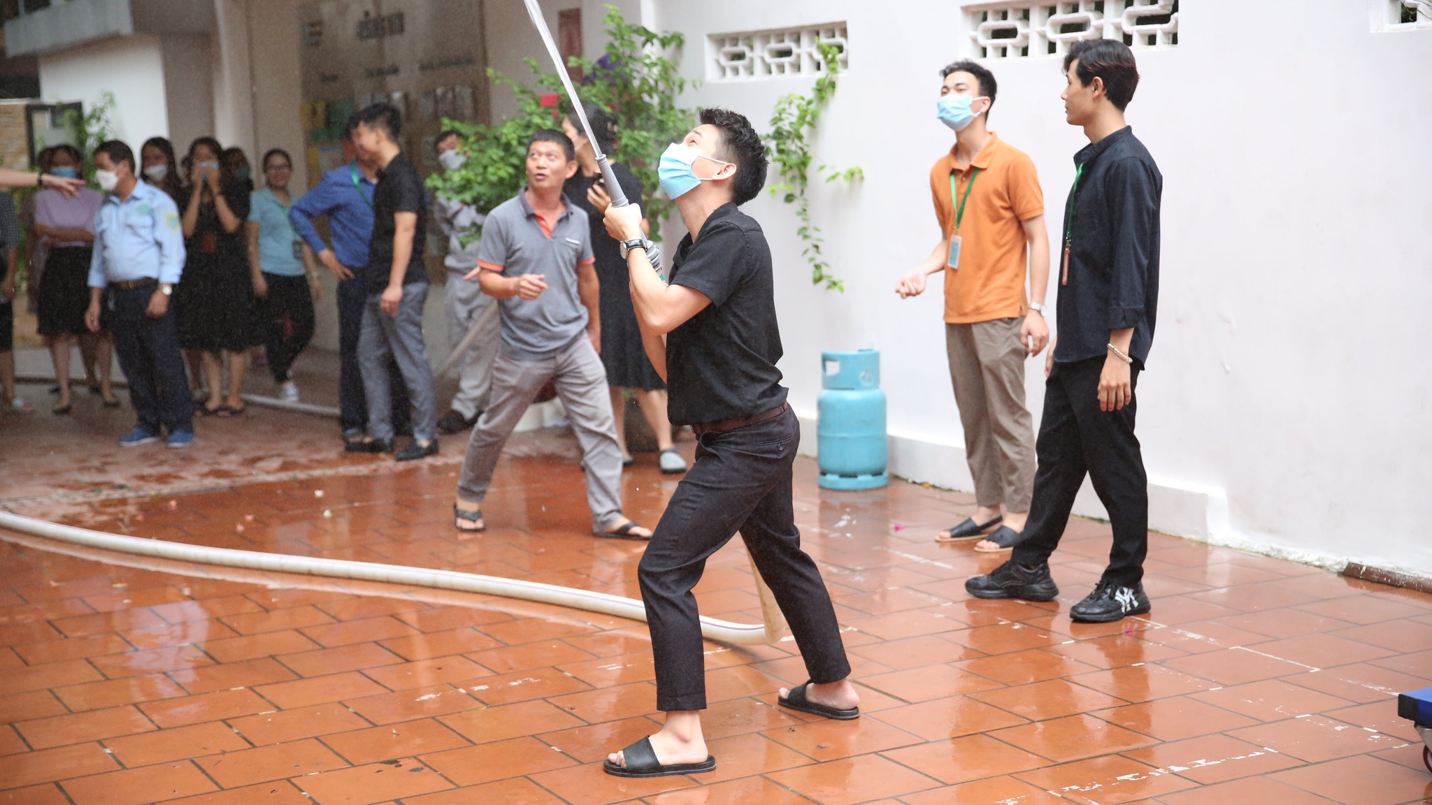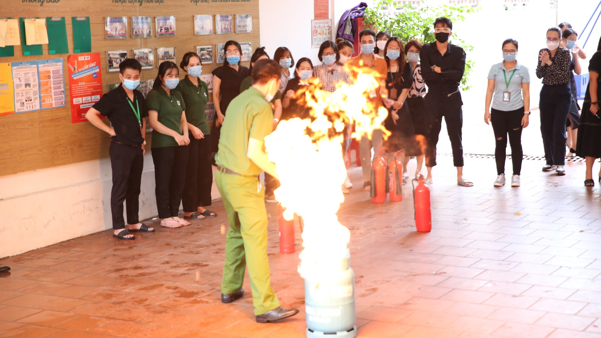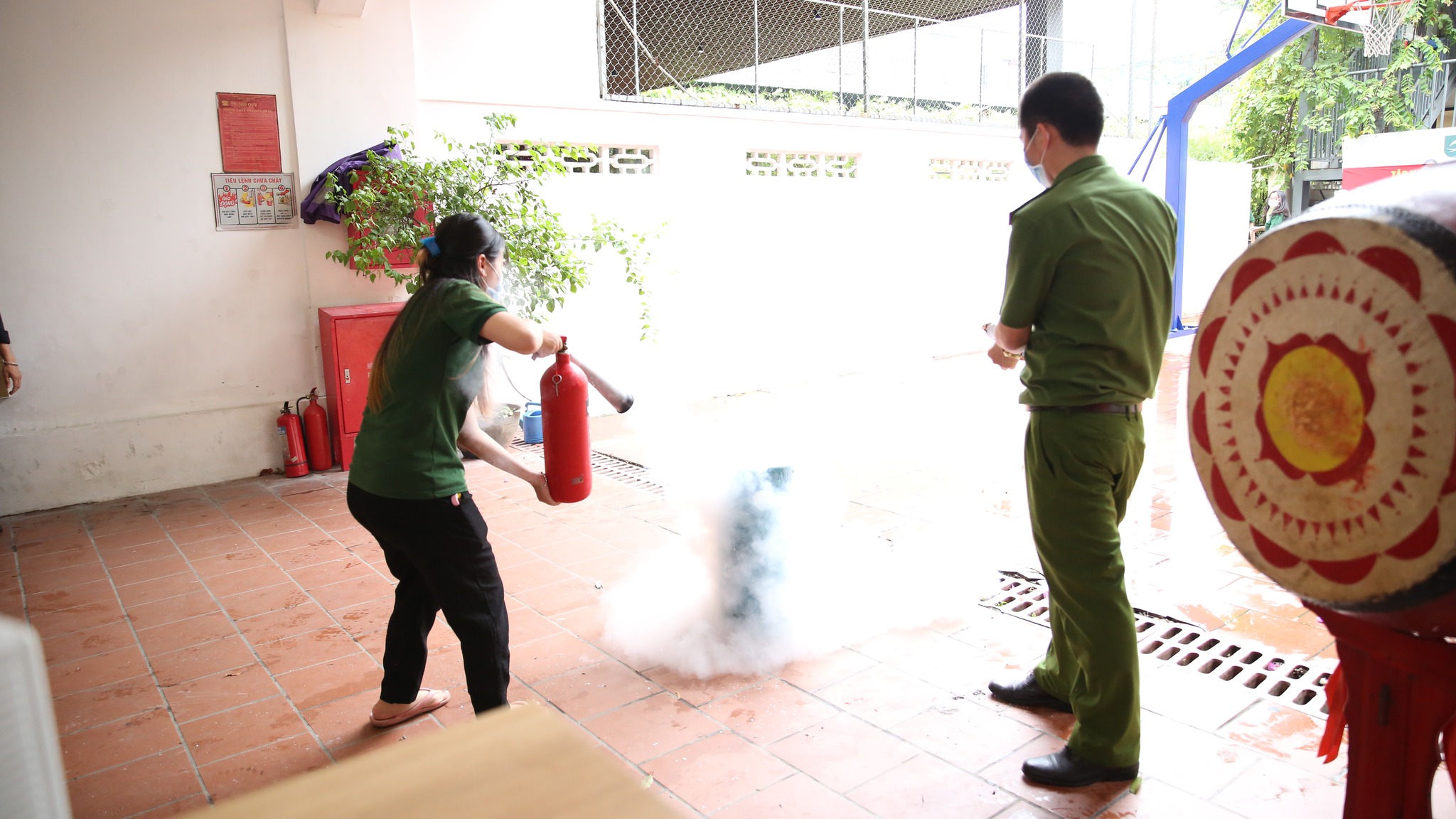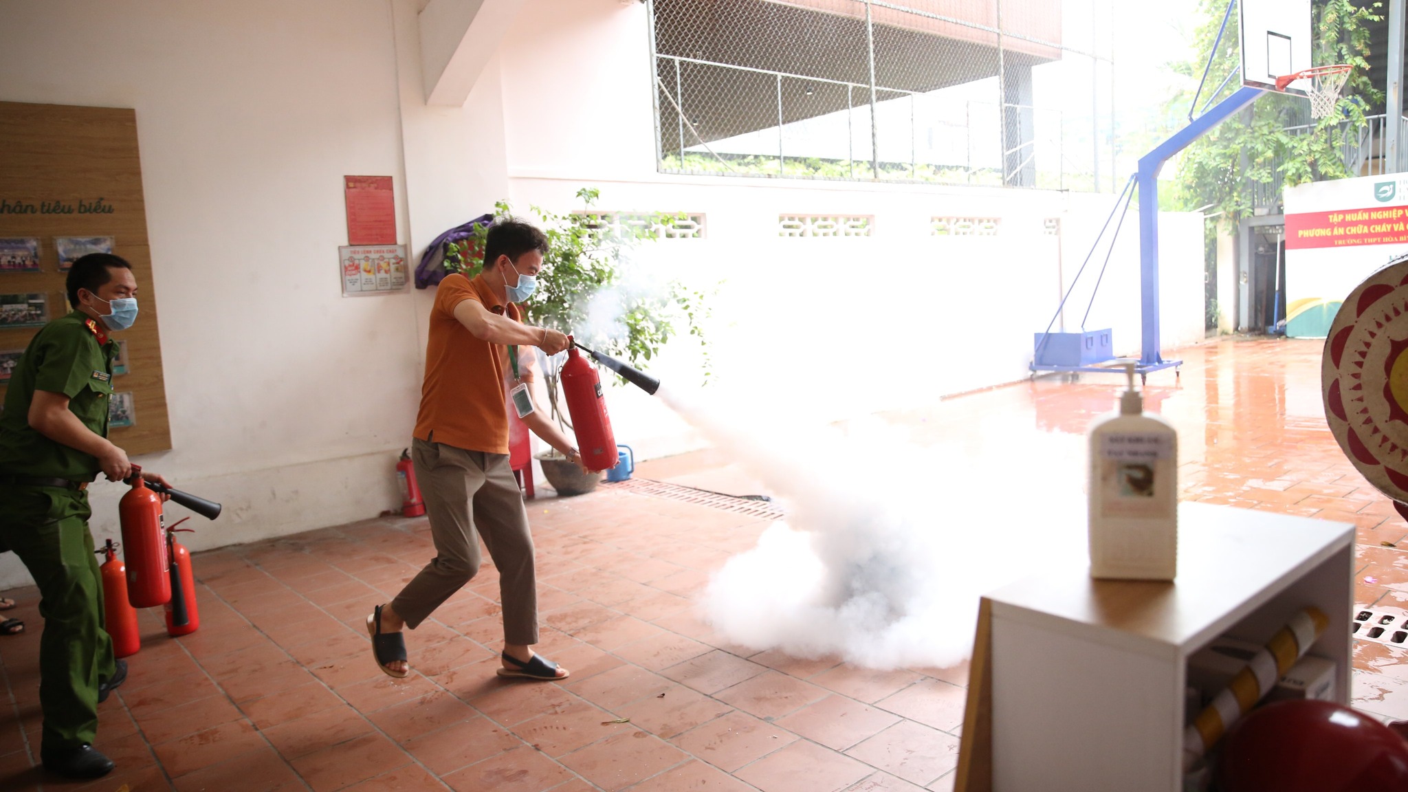 Tại buổi diễn tập, các thầy cô cũng đã được thực hành các tình huống sử dụng bình chữa cháy, sử dụng vòi chữa cháy dập tắt đám cháy, xử lý sự cố, thoát hiểm…