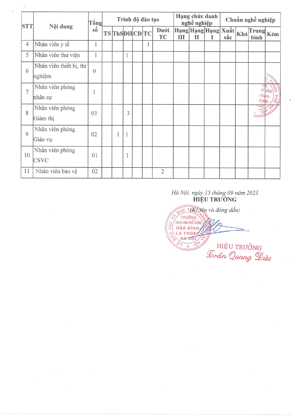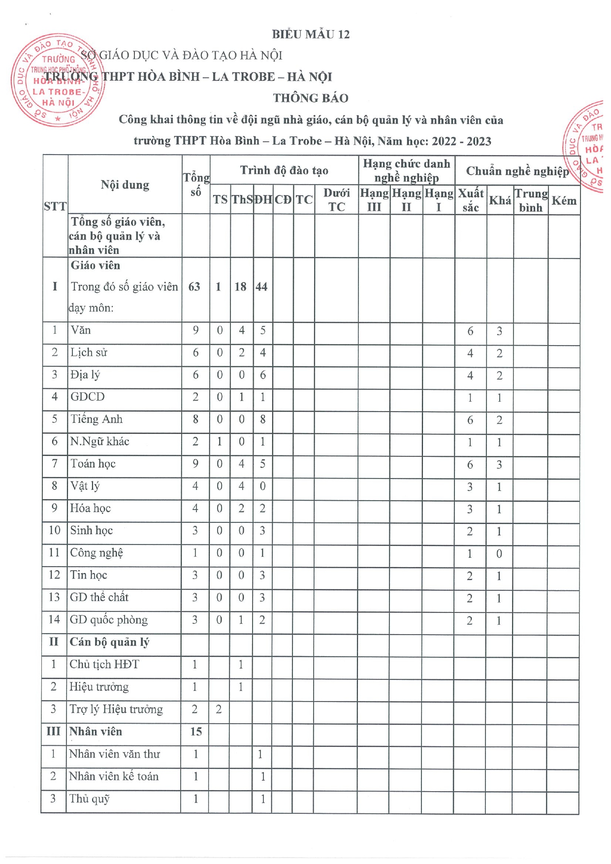 Thông báo công khai thông tin về đội ngũ nhà giáo, cán bộ quản lý và nhân viên của trường THPT Hòa Bình - La Trobe - Hà Nội, năm học 2022-2023