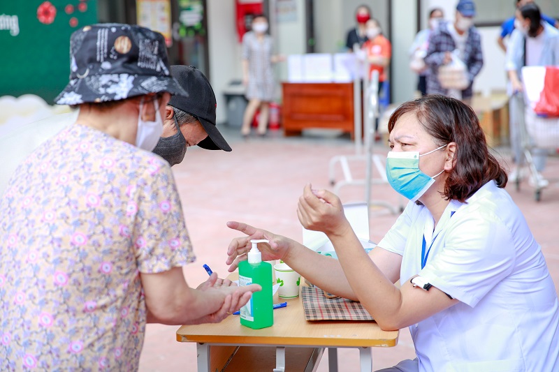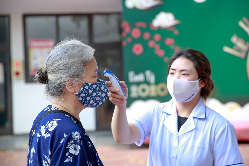 Mỗi người dân đến nhận quà đều được đo thân nhiệt, rửa tay bằng dung dịch sát khuẩn, đeo khẩu trang và ngồi giữ khoảng cách trên 2m để đảm bảo an toàn phòng chống dịch.