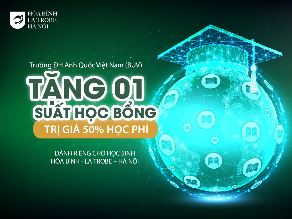 Nằm trong khuôn khổ chương trình hợp tác chiến lược giữa Trường Đại học Anh Quốc Việt Nam (BUV ) và trường Hòa Bình La Trobe – Hà Nội, BUV đã phê duyệt các suất học bổng dành riêng cho học sinh đang theo học tại trường Hòa Bình – La Trobe – Hà Nội, giúp cho các em học sinh có năng lực và tố chất nổi trội có thêm nhiều cơ hội được học tập và phát triển trong môi trường giáo dục quốc tế tại ĐH BUV. Năm học 2021-2022, BUV dành riêng cho Hòa Bình La Trobe – Hà Nội 01 suất học bổng trị giá 50% học phí.
