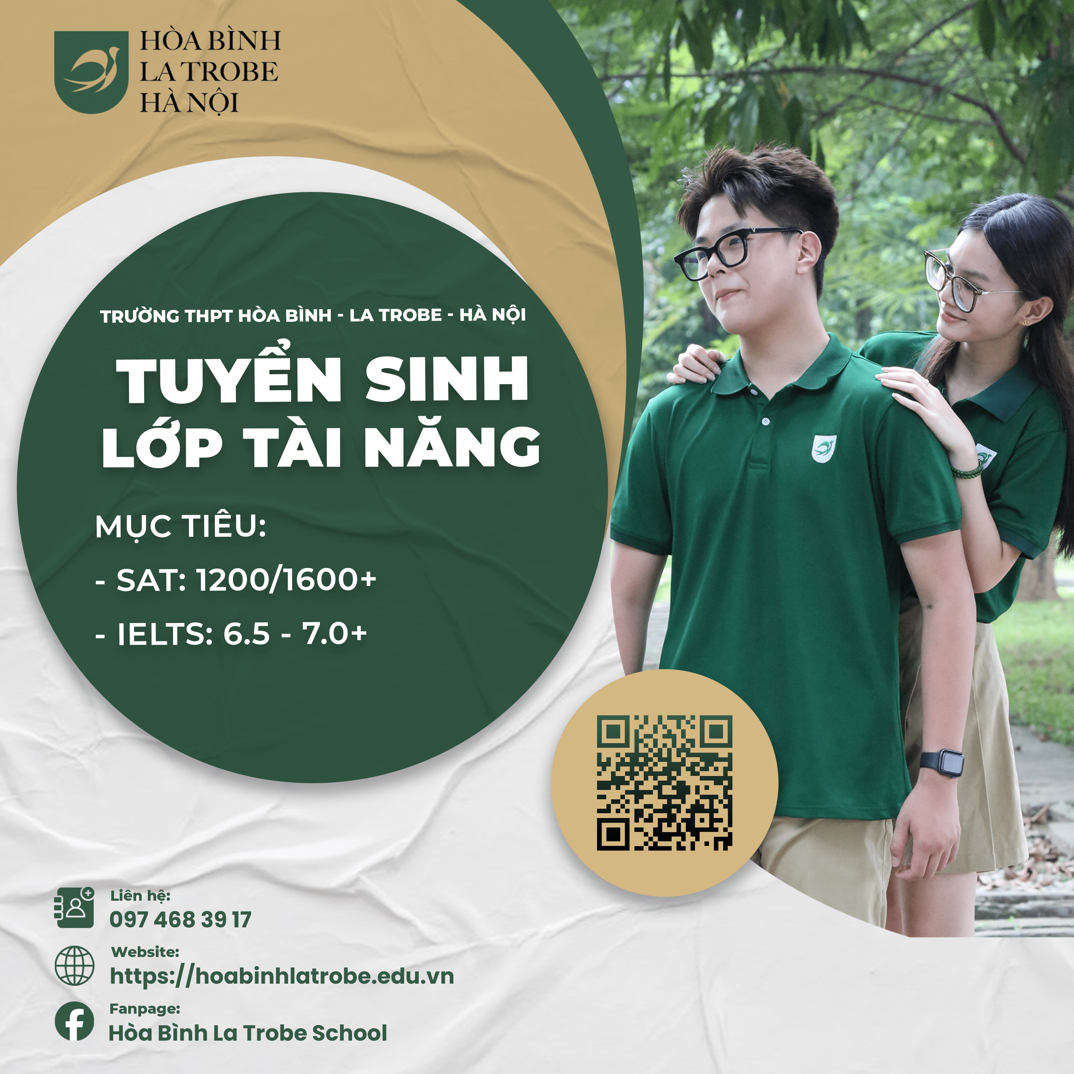 Năm học 2024-2025, trường THPT Hòa Bình - La Trobe - Hà Nội chính thức tuyển sinh chương trình Tài năng với mũi nhọn đào tạo là SAT (Scholastic Assessment Test - một trong những kỳ thi chuẩn hóa phổ biến, được các trường đại học Mỹ sử dụng kết quả để xét tuyển sinh viên) và IELTS (International English Language Testing System - Hệ thống Kiểm tra Anh ngữ Quốc tế)
