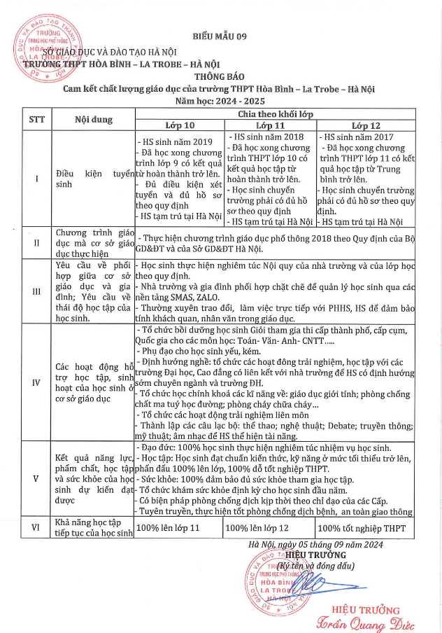 1. Thông báo cam kết chất lượng giáo dục của trường THPT Hòa Bình - La Trobe - Hà Nội năm học 2024-2025