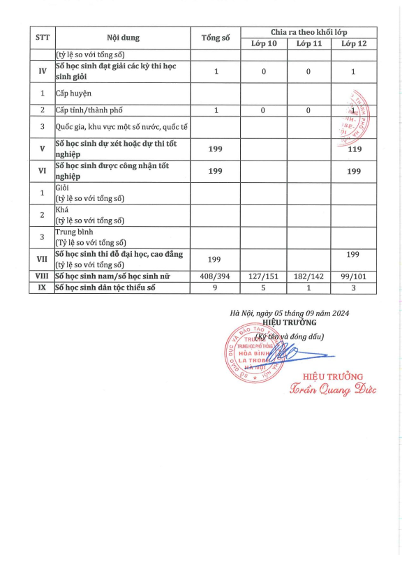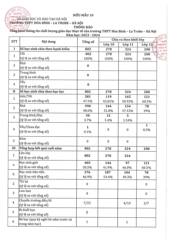 2. Thông báo Công khai thông tin chất lượng giáo dục thực tế của trường THPT Hòa Bình - La Trobe - Hà Nội năm học 2023-2024