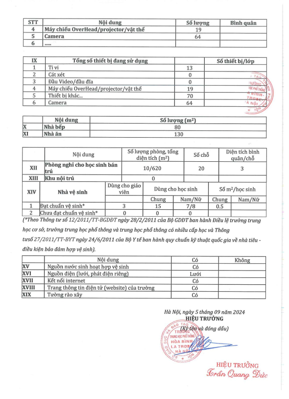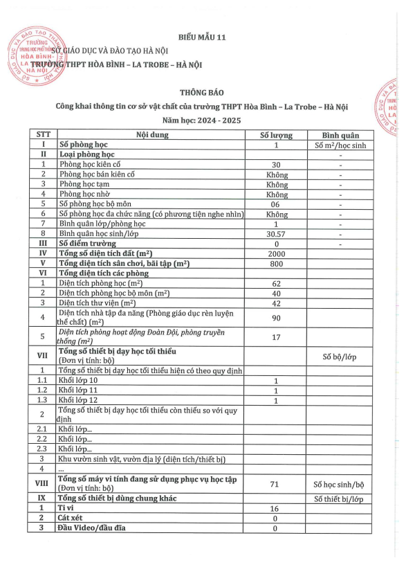 3. Công khai thông tin cơ sở vật chất của trường THPT Hòa Bình - La Trobe - Hà Nội năm học 2024-2025