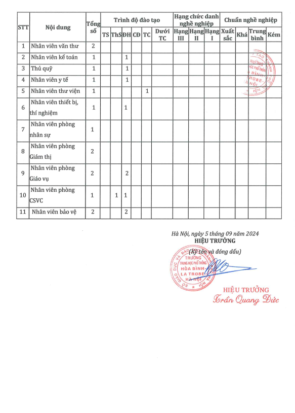 4. Thông báo Công khai thông tin về đội ngũ nhà giáo, cán bộ quản lý của trường THPT Hòa Bình - La Trobe - Hà Nội năm học 2024-2025