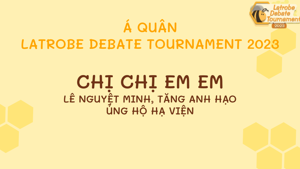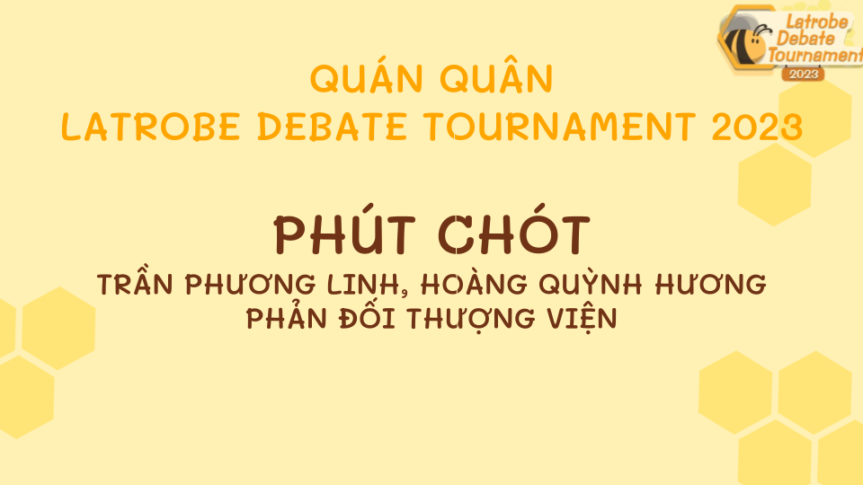 Hòa Bình La Trobe Hà Nội xin chúc mừng đội thi "Phút Chót" với các thành viên Trần Phương Linh (THPT Chuyên Sư phạm) và Hoàng Quỳnh Hương (Le Semoir - CHV Debate Society) đã vượt qua 59 đội thi và 9 trận đấu căng thẳng để trở thành nhà vô địch giải đấu
