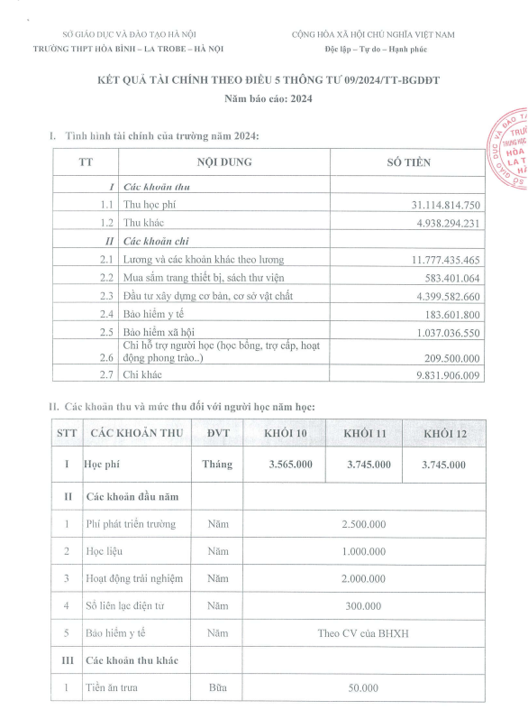 Thông báo công khai thu chi tài chính trường THPT Hòa Bình - La Trobe - Hà Nội, năm học 2024 theo Thông tư 09/2024/TT-BGDĐT ngày 03 tháng 06 năm 2024