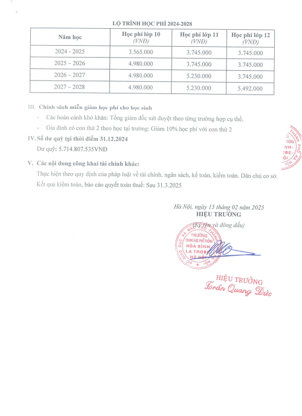 Thông báo công khai thu chi trường THPT Hòa Bình - La Trobe - Hà Nội, năm 2024