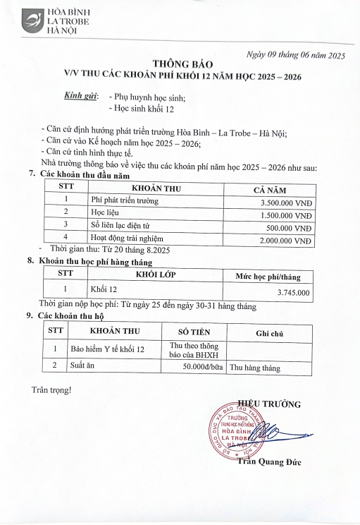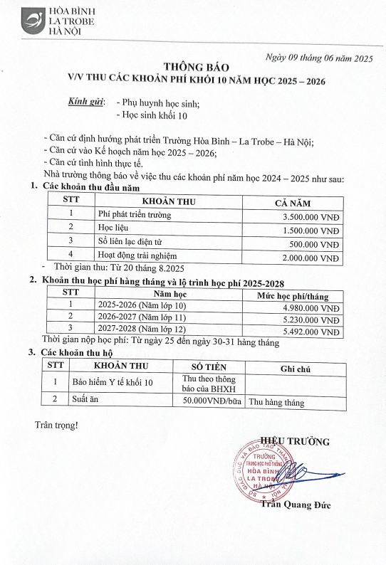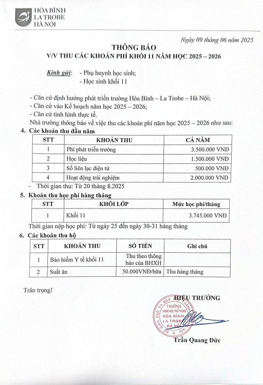 Thông báo học phí và các khoản thu năm học 2025-2026