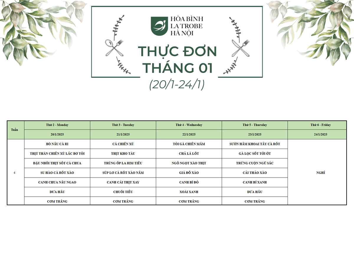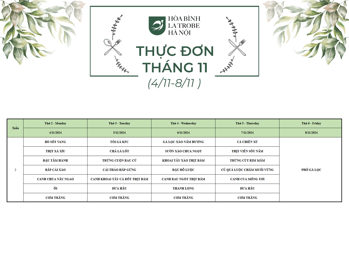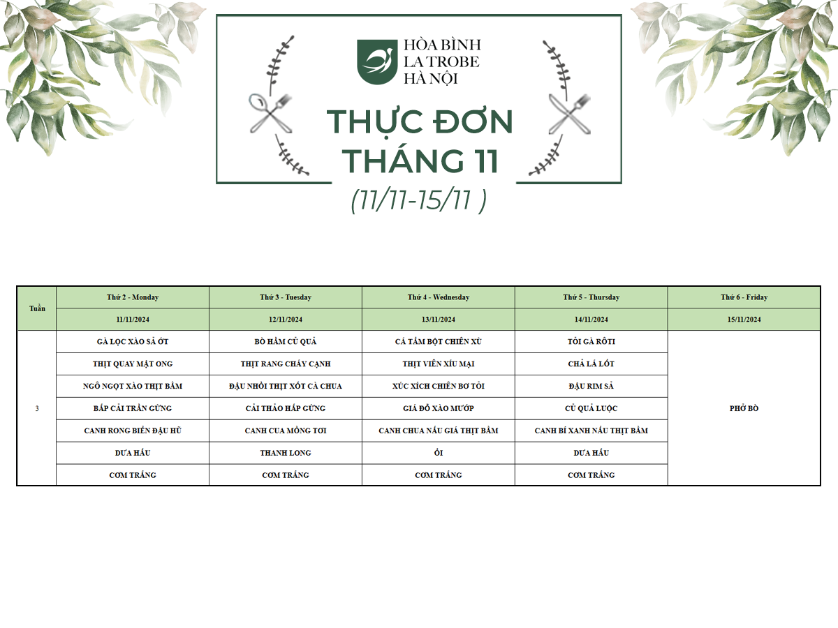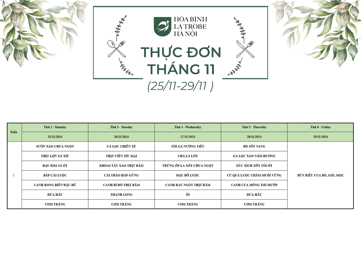 Bữa ăn bán trú của học sinh Hòa Bình – La Trobe – Hà Nội không chỉ cung cấp đầy đủ dinh dưỡng theo nhu cầu mà còn đảm bảo an toàn vệ sinh thực phẩm, giúp các con phát triển một cách toàn diện cả về trí lực và thể lực mỗi ngày.