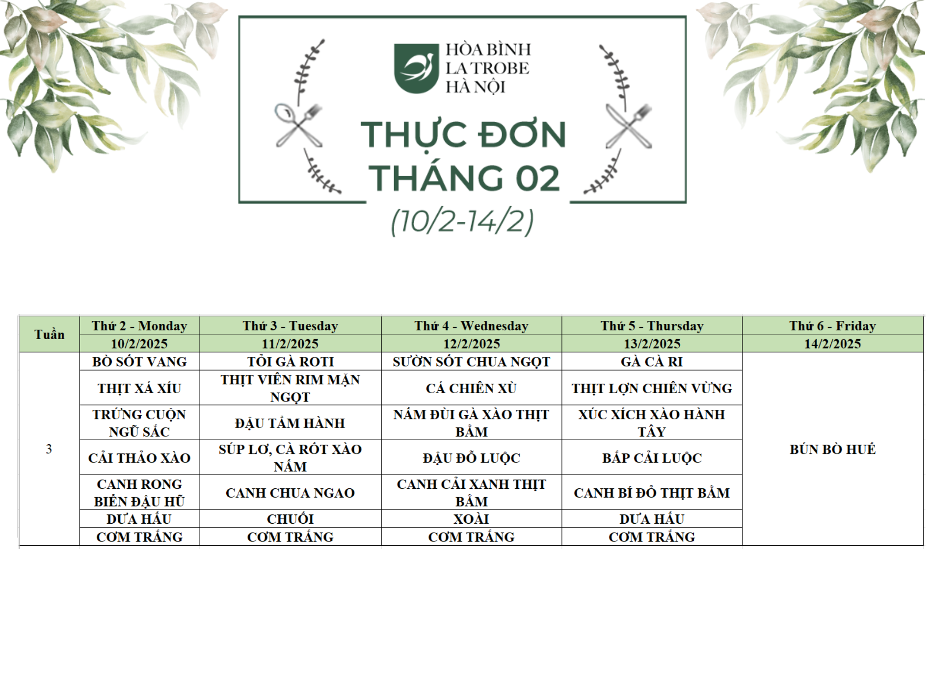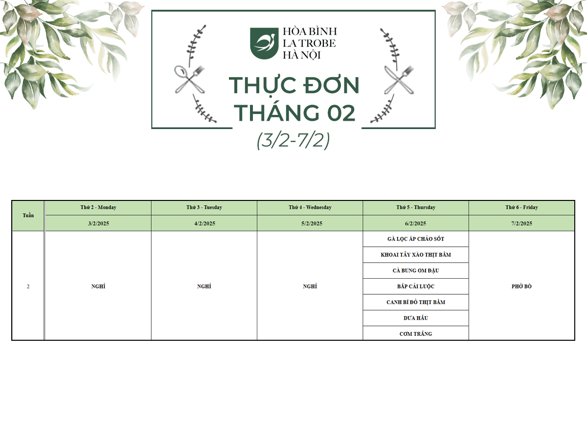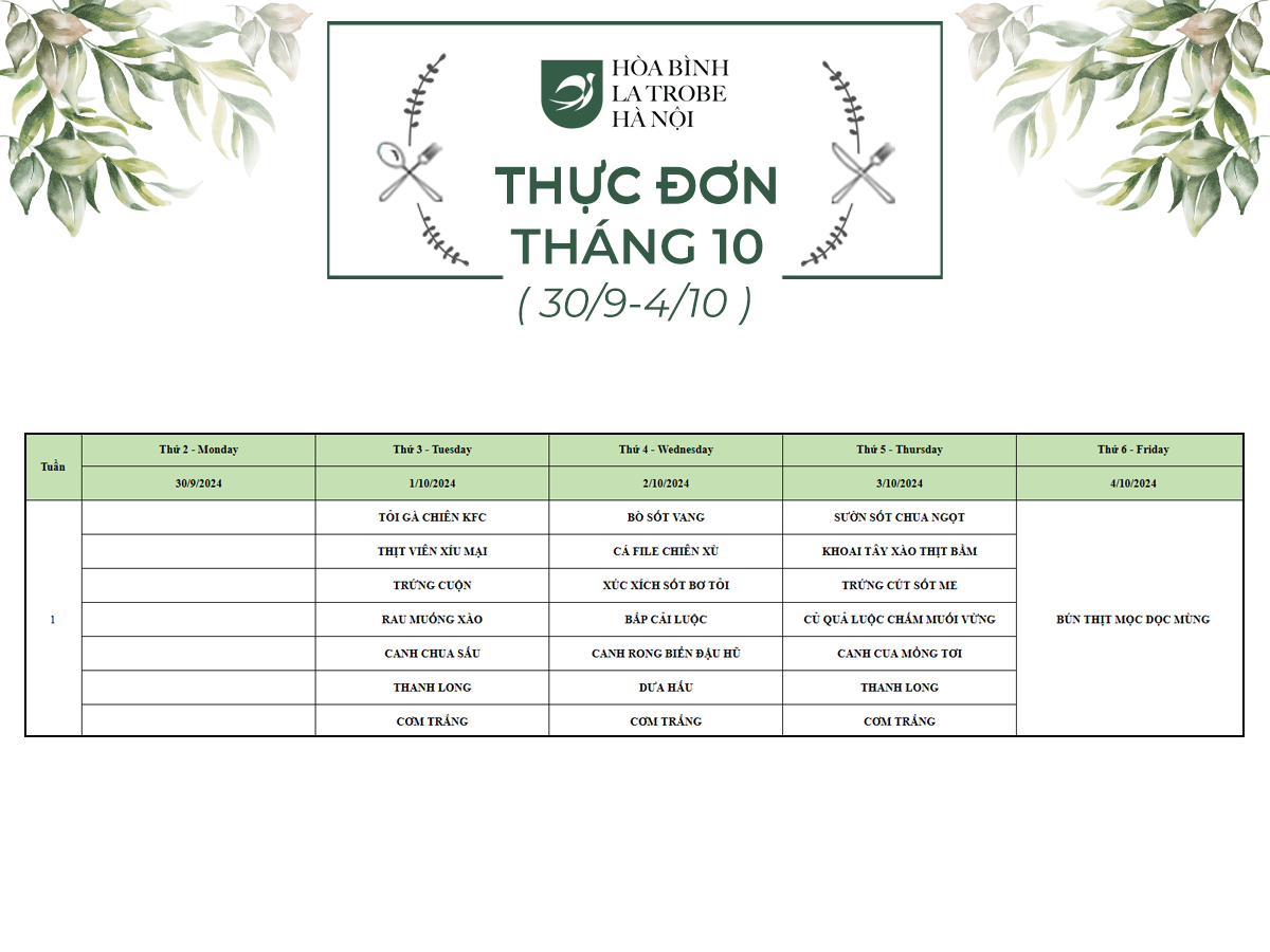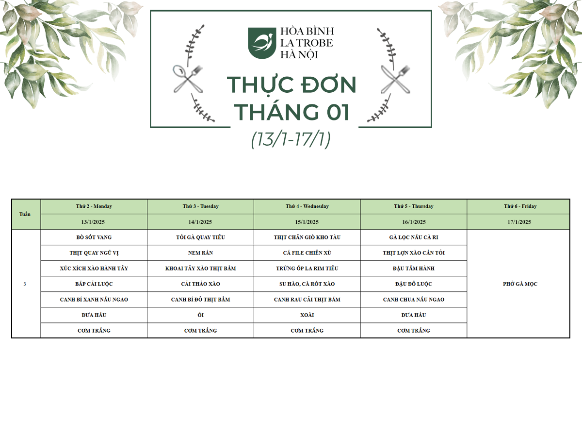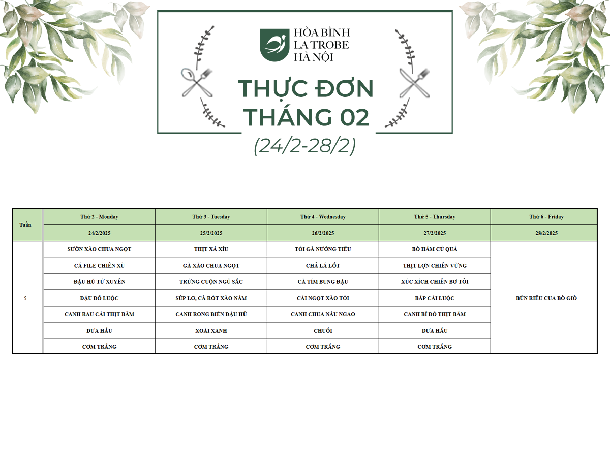 Bữa ăn bán trú của học sinh Hòa Bình – La Trobe – Hà Nội không chỉ cung cấp đầy đủ dinh dưỡng theo nhu cầu mà còn đảm bảo an toàn vệ sinh thực phẩm, giúp các con phát triển một cách toàn diện cả về trí lực và thể lực mỗi ngày.