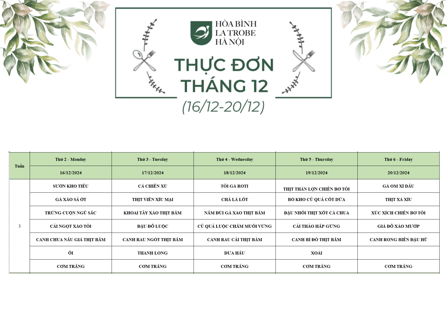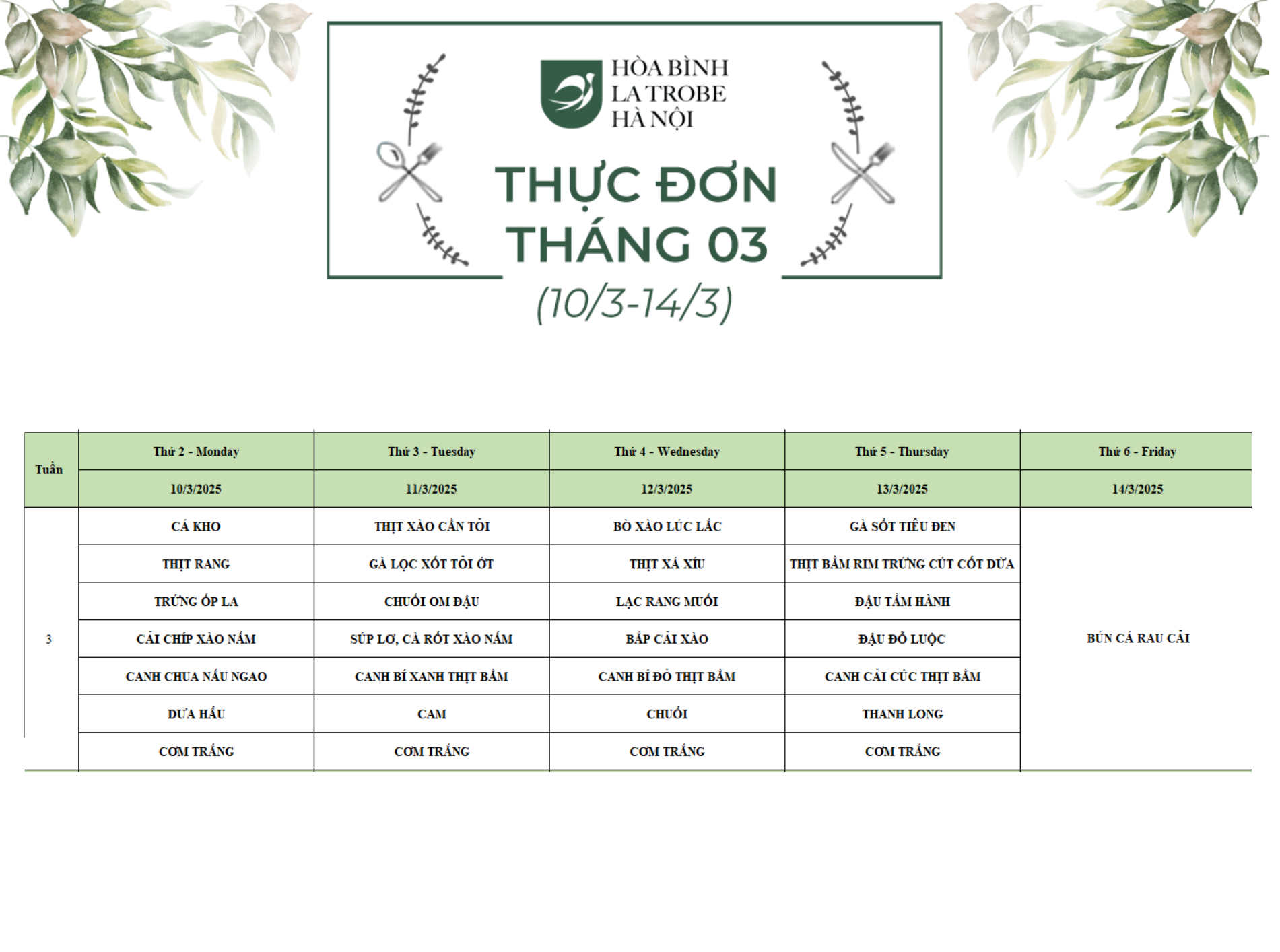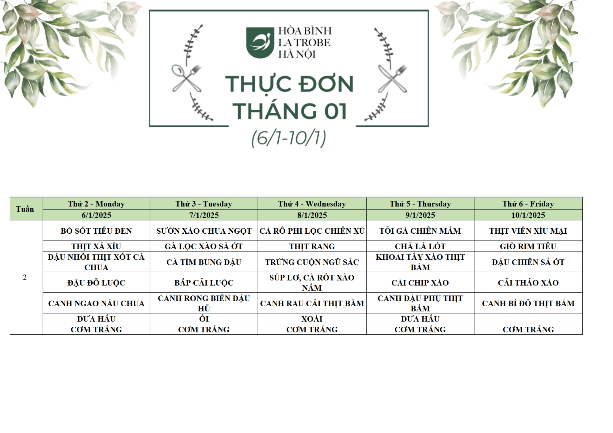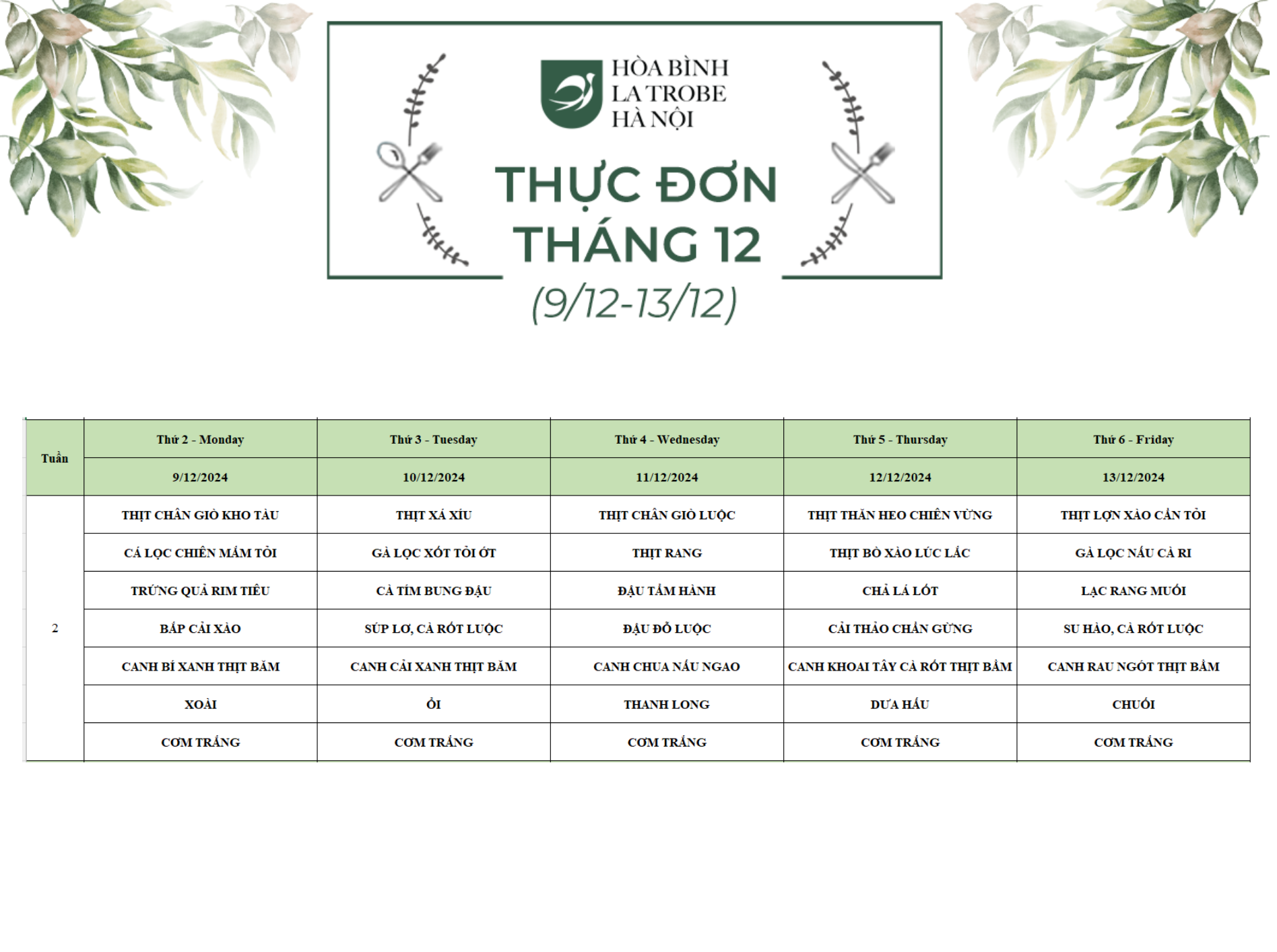 Bữa ăn bán trú của học sinh Hòa Bình – La Trobe – Hà Nội không chỉ cung cấp đầy đủ dinh dưỡng theo nhu cầu mà còn đảm bảo an toàn vệ sinh thực phẩm, giúp các con phát triển một cách toàn diện cả về trí lực và thể lực mỗi ngày.