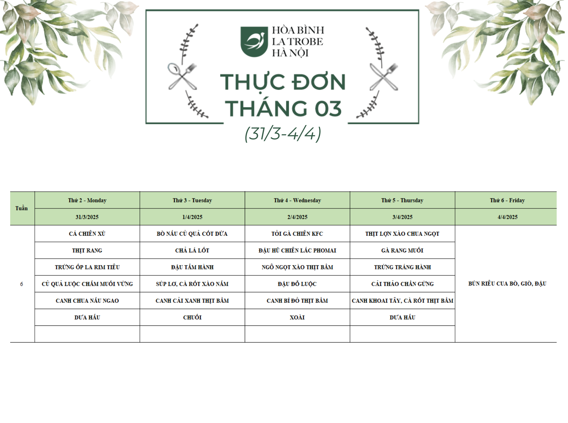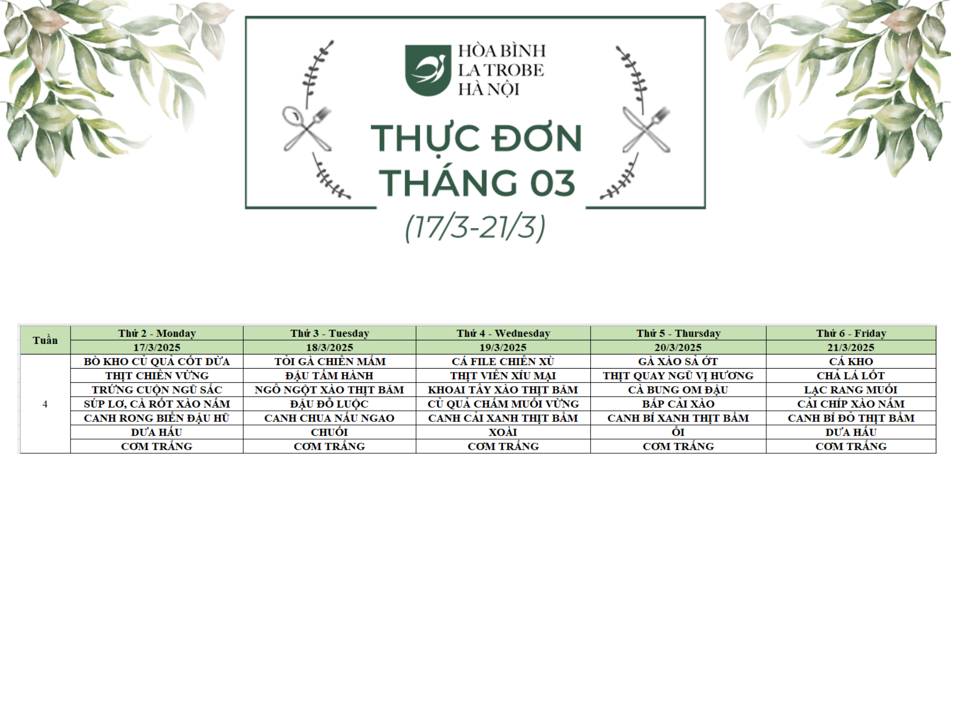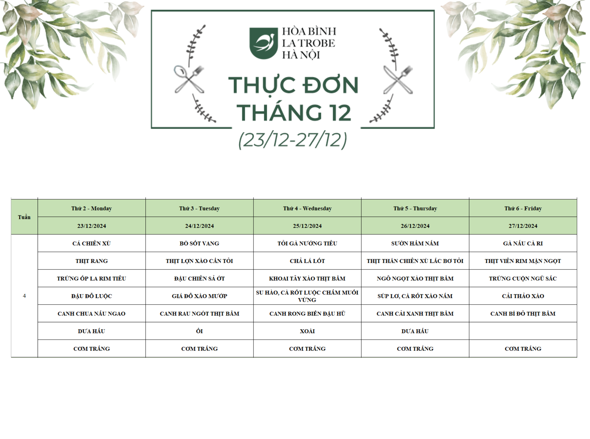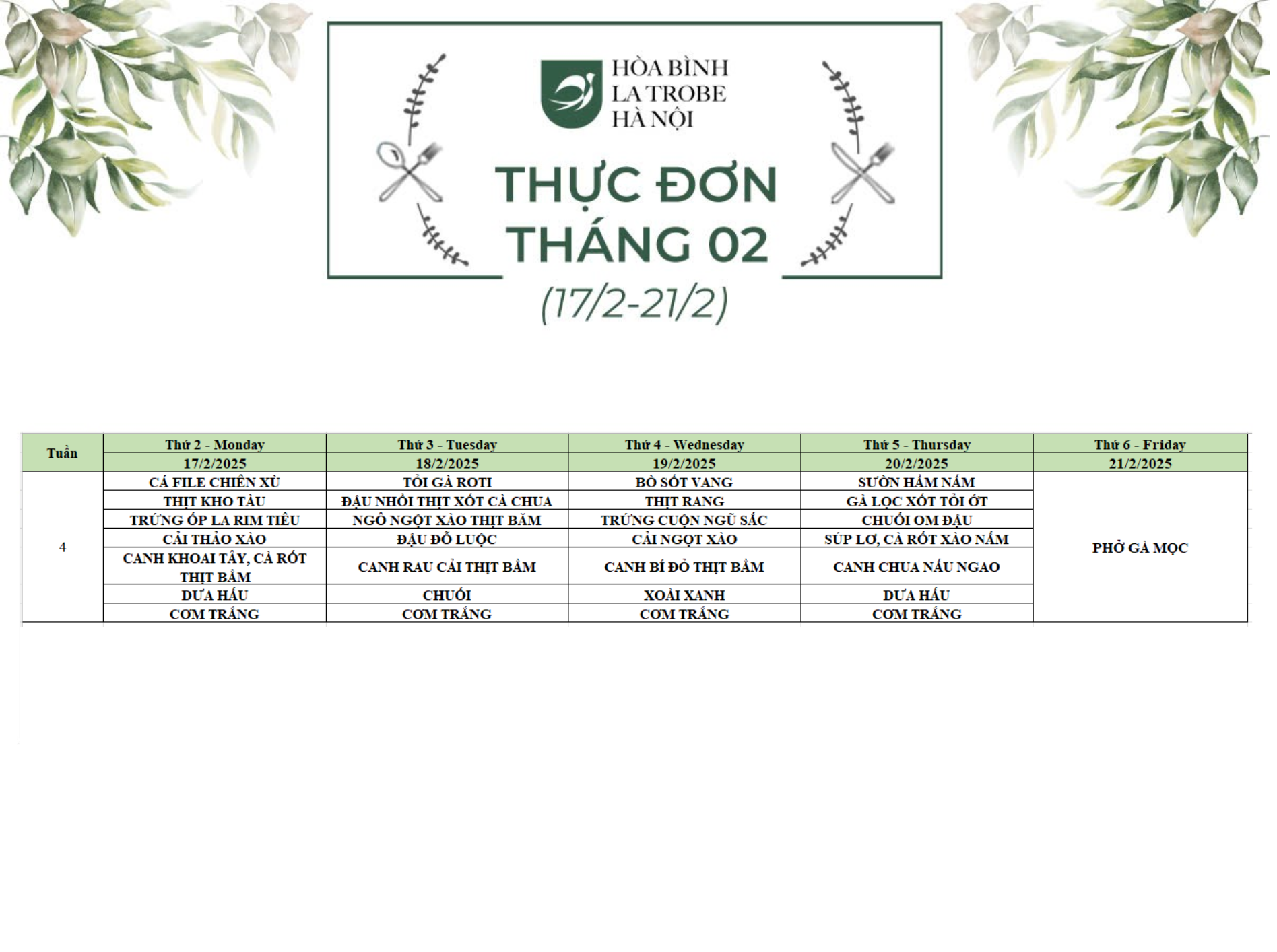 Bữa ăn bán trú của học sinh Hòa Bình – La Trobe – Hà Nội không chỉ cung cấp đầy đủ dinh dưỡng theo nhu cầu mà còn đảm bảo an toàn vệ sinh thực phẩm, giúp các con phát triển một cách toàn diện cả về trí lực và thể lực mỗi ngày.